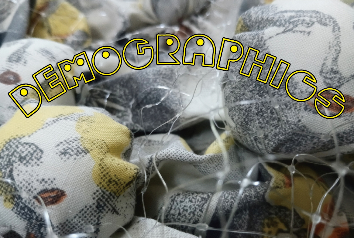 Demographics では、主にジャガイモサンプルを、数学的な意味合いでのx やnに見立て、「擬芋化」されたハリボテ、ひいては匿名であり擬人化された個の集合体、あるいは層として扱う。そしてその擬人化された集合体、集合体の属性、行動を観察し、認識する「個人」(鑑賞者)の有するペルソナの複合性、コラージュ性、空想性を見つめる機会の提起を試みる。
